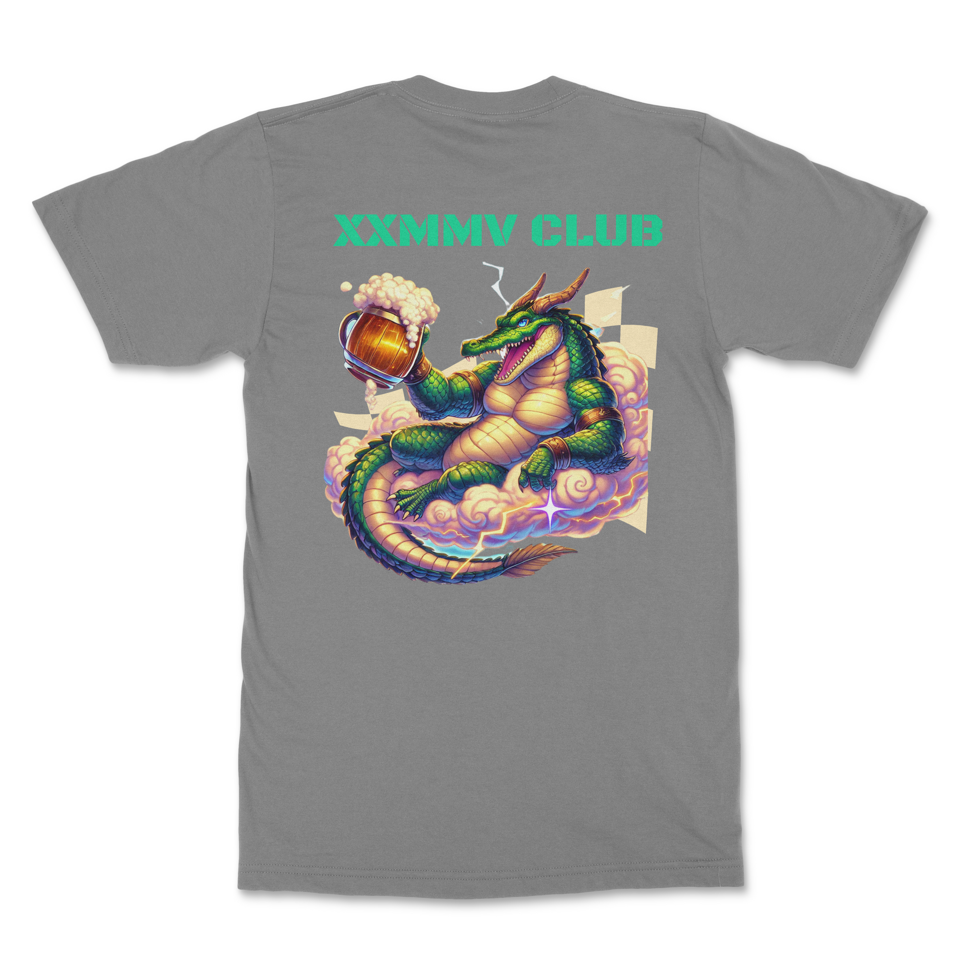 • Back Graphic: Vibrant dragon lounging in the clouds with a beer mug, featuring the bold "XXMMV CLUB" label, symbolizing carefree indulgence and bold personality.
