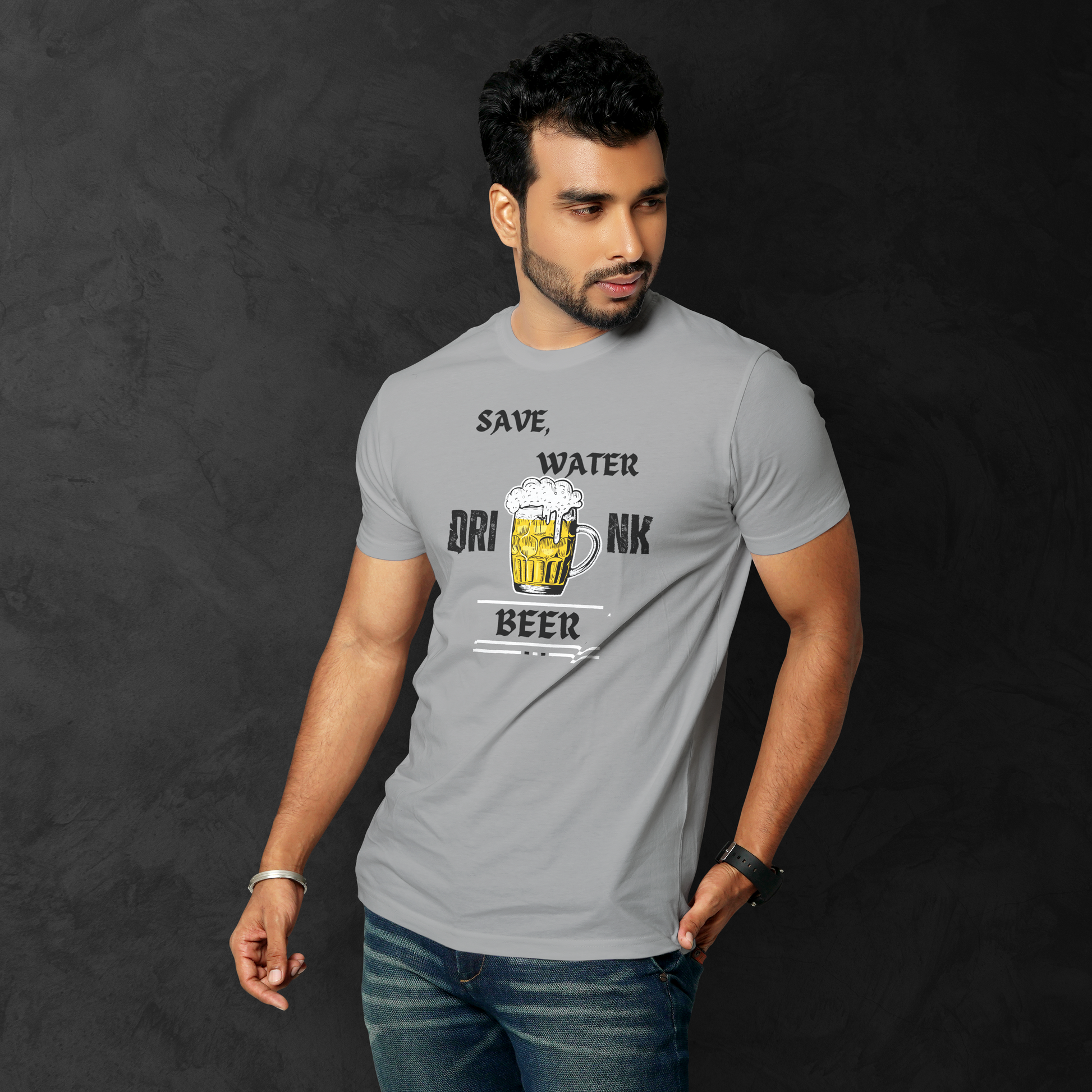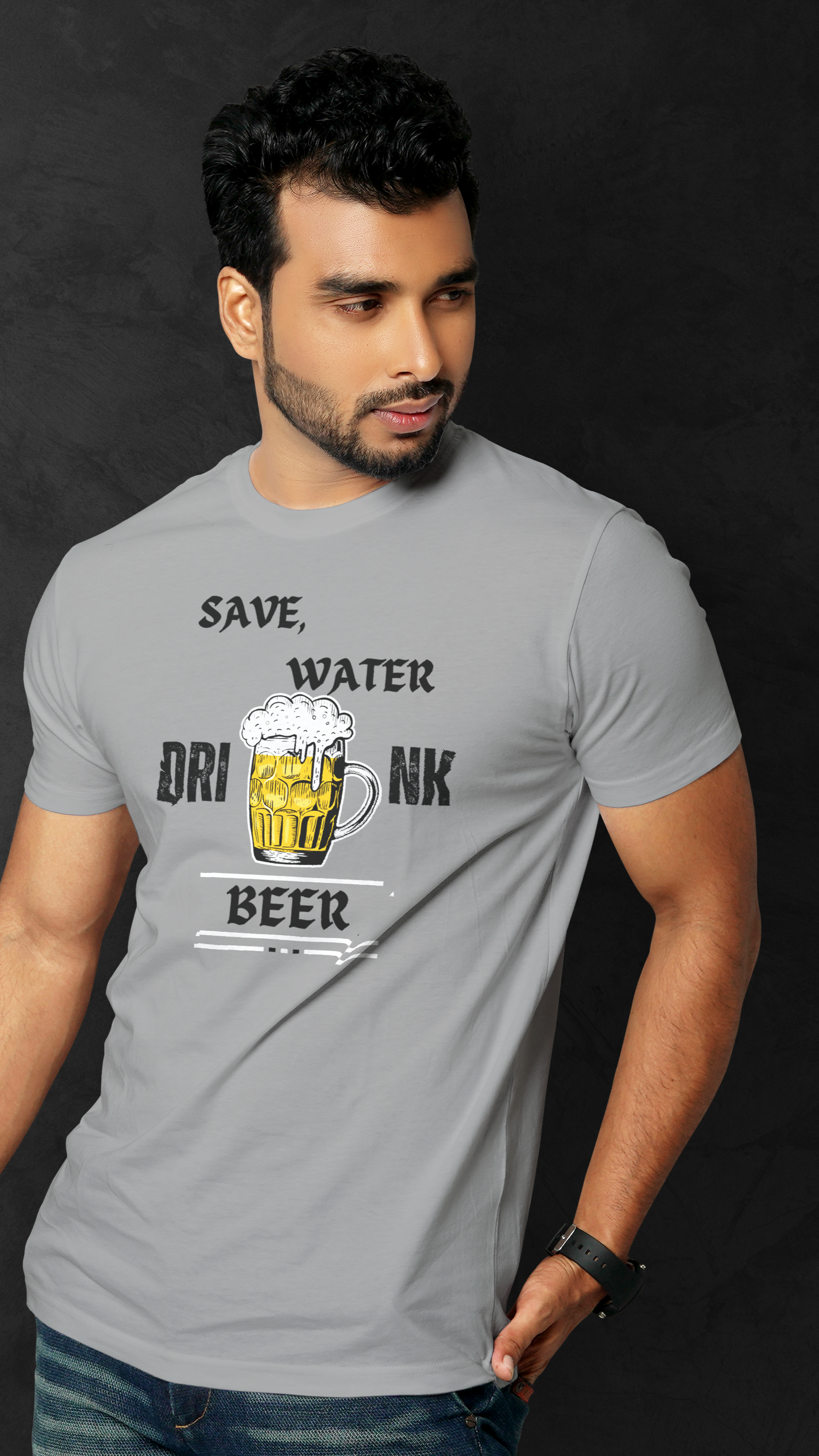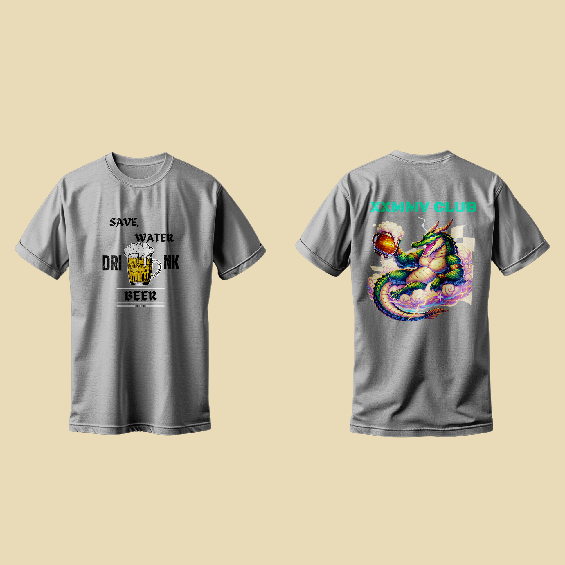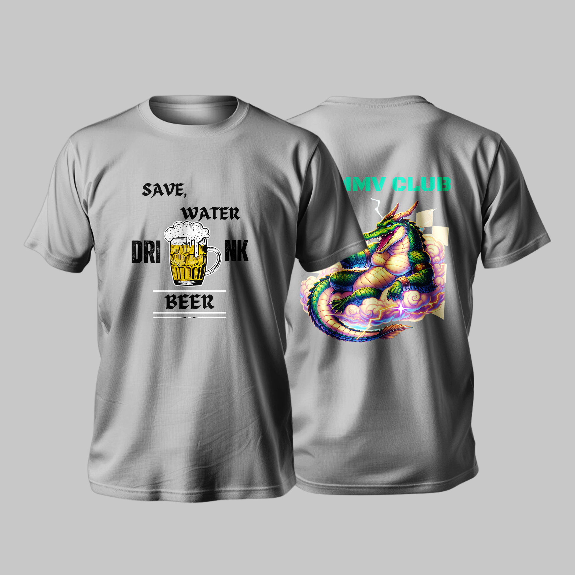 • Front Design: Playful "Save Water, Drink Beer" text with a frothy beer mug illustration for an eye-catching front statement.