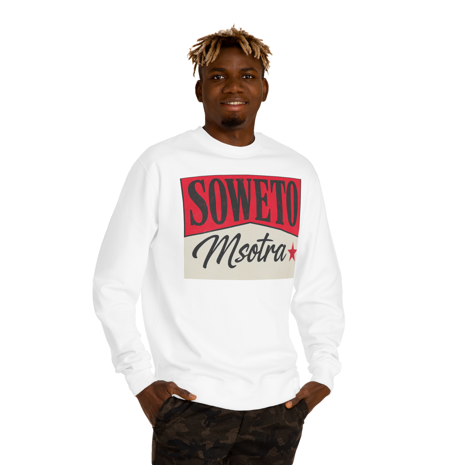 Pay tribute to the heart of Jozi with the Soweto Msotra Sweatshirt, a bold and clean design that blends township pride with urban swagger. Featuring a powerful red-and-black “SOWETO” graphic and the word “Msotra” in sleek script, this cream crewneck radiates confidence, authenticity, and local flair.