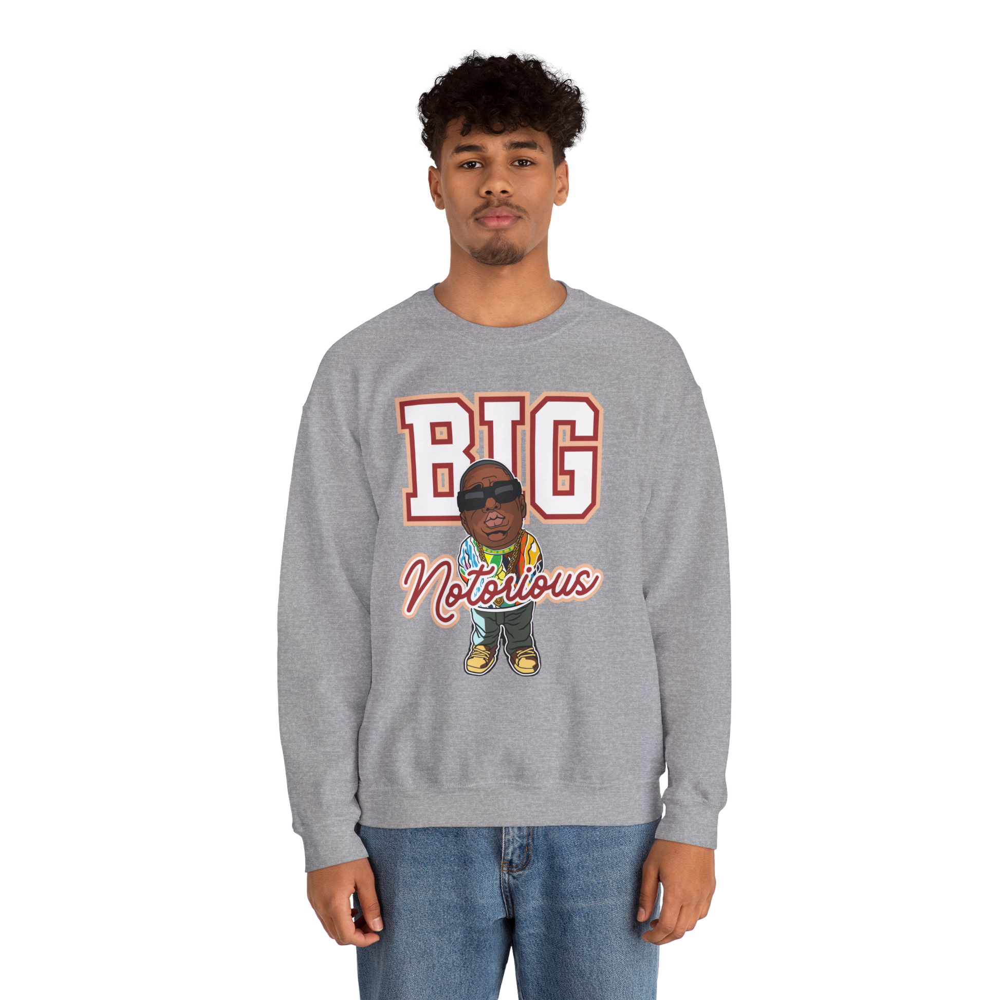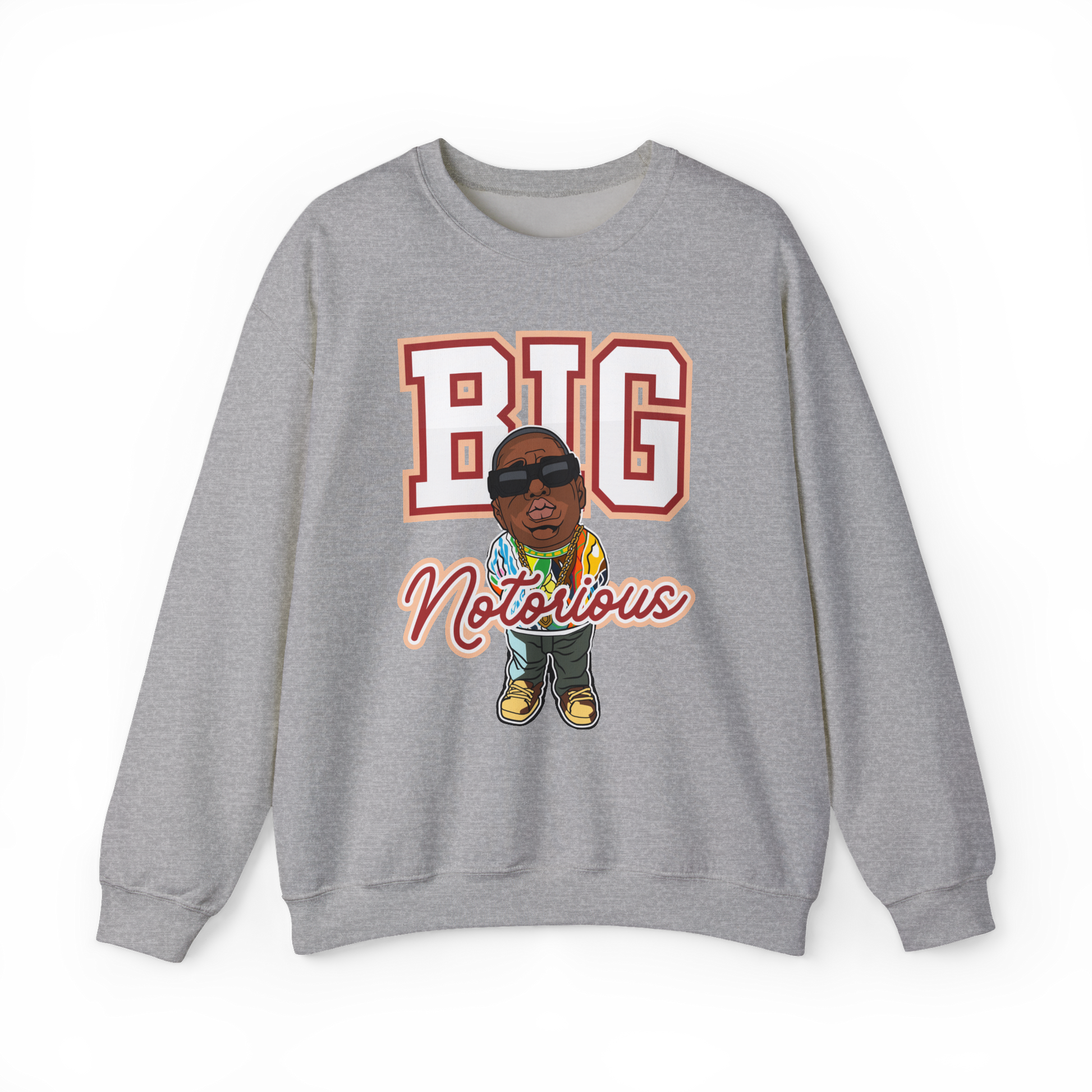 Celebrate hip-hop royalty with the BIG Notorious Sweatshirt, featuring a bold varsity-style “BIG” print and a cartoon graphic of the legendary rapper in his signature shades and colorful Coogi sweater. Designed for true fans of the golden era, this grey crewneck blends nostalgia, attitude, and streetwear flair into one iconic piece.