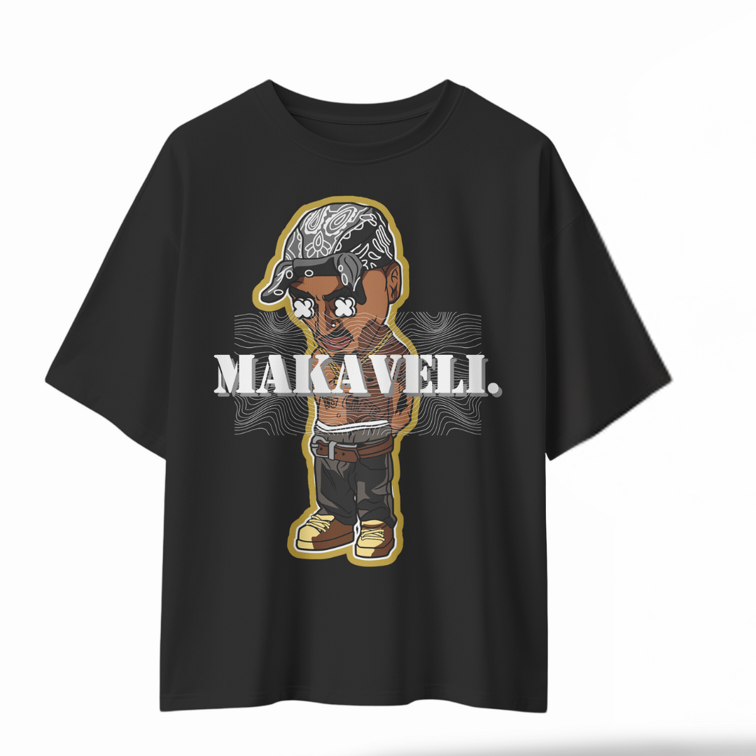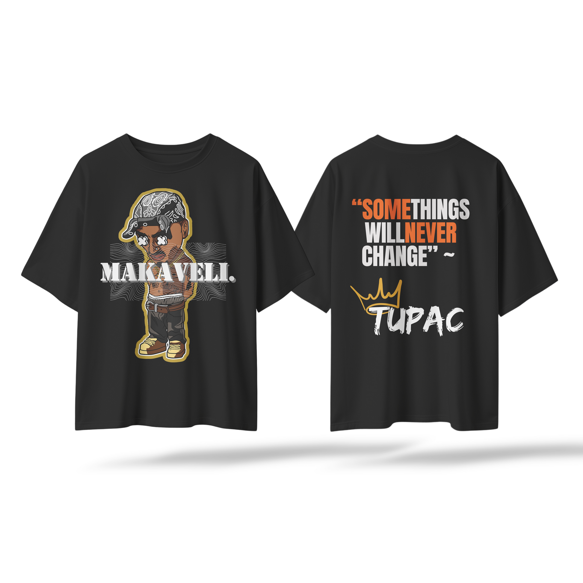 - Front Design: A creative caricature of Tupac in his iconic style, accompanied by bold "Makaveli" text.