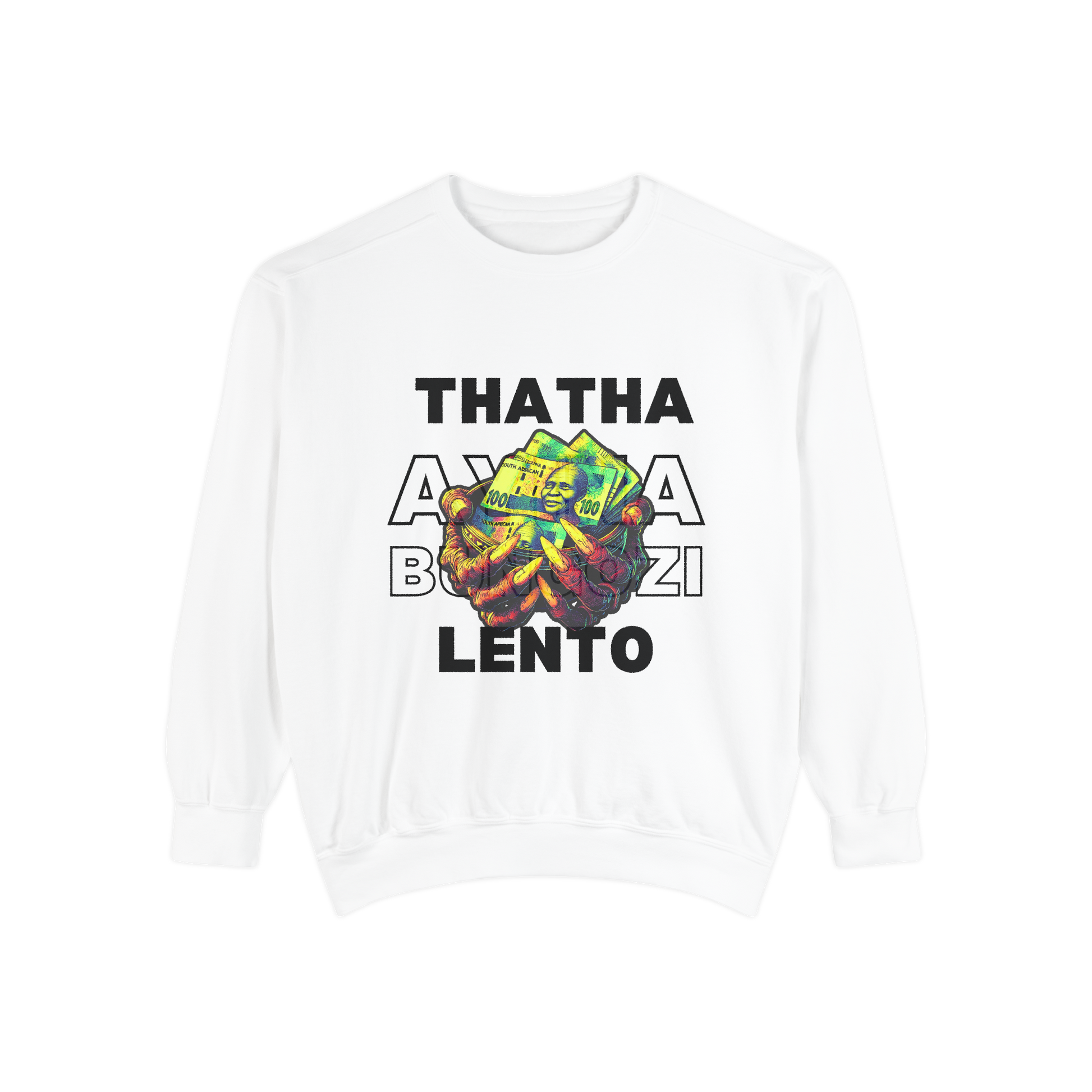 Make a bold statement with the “THATHA LENTO” sweater, featuring eye-catching South African currency artwork. Crafted for comfort and style, this lightweight unisex sweater is perfect for streetwear lovers who speak through fashion. Available in black and white.