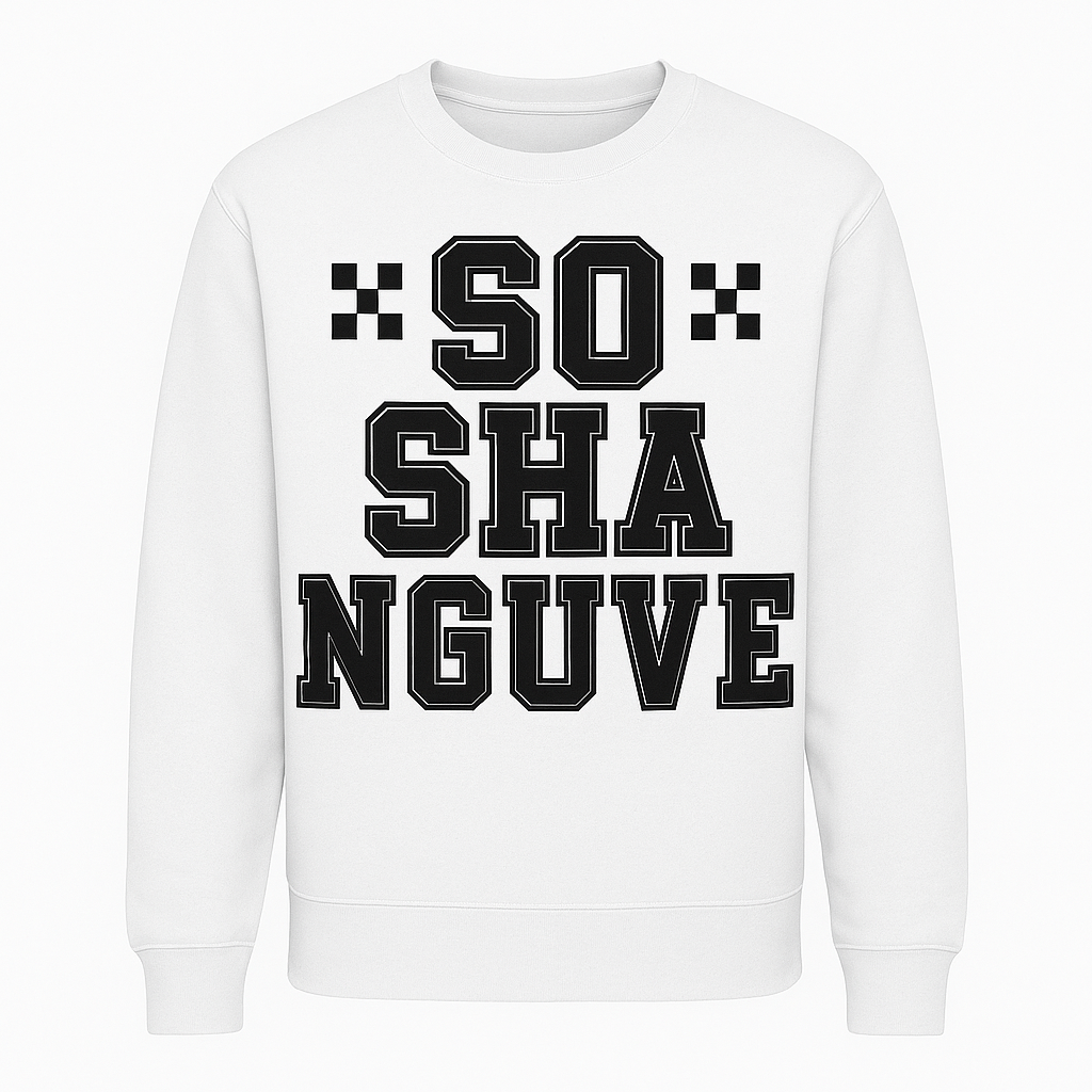 Turn heads and show pride with the Soshanguve Crewneck Sweatshirt, a clean yet powerful statement piece inspired by one of Gauteng’s most iconic townships. Featuring bold varsity-style black lettering and unique checker accents on a crisp white sweatshirt, this design blends cultural pride with a strong street aesthetic.