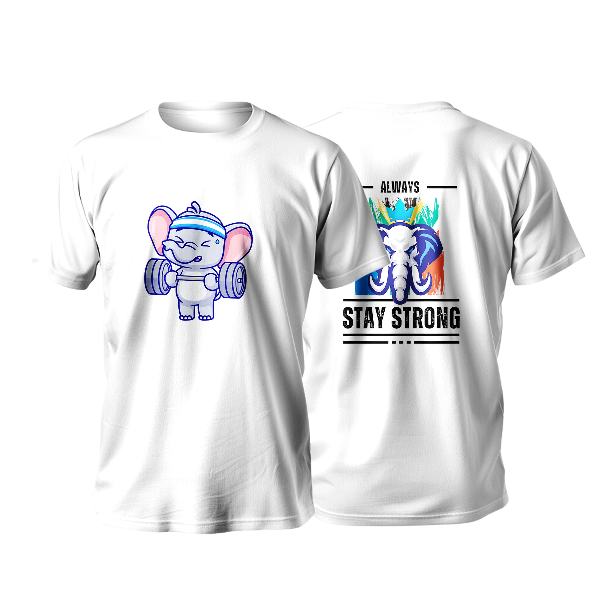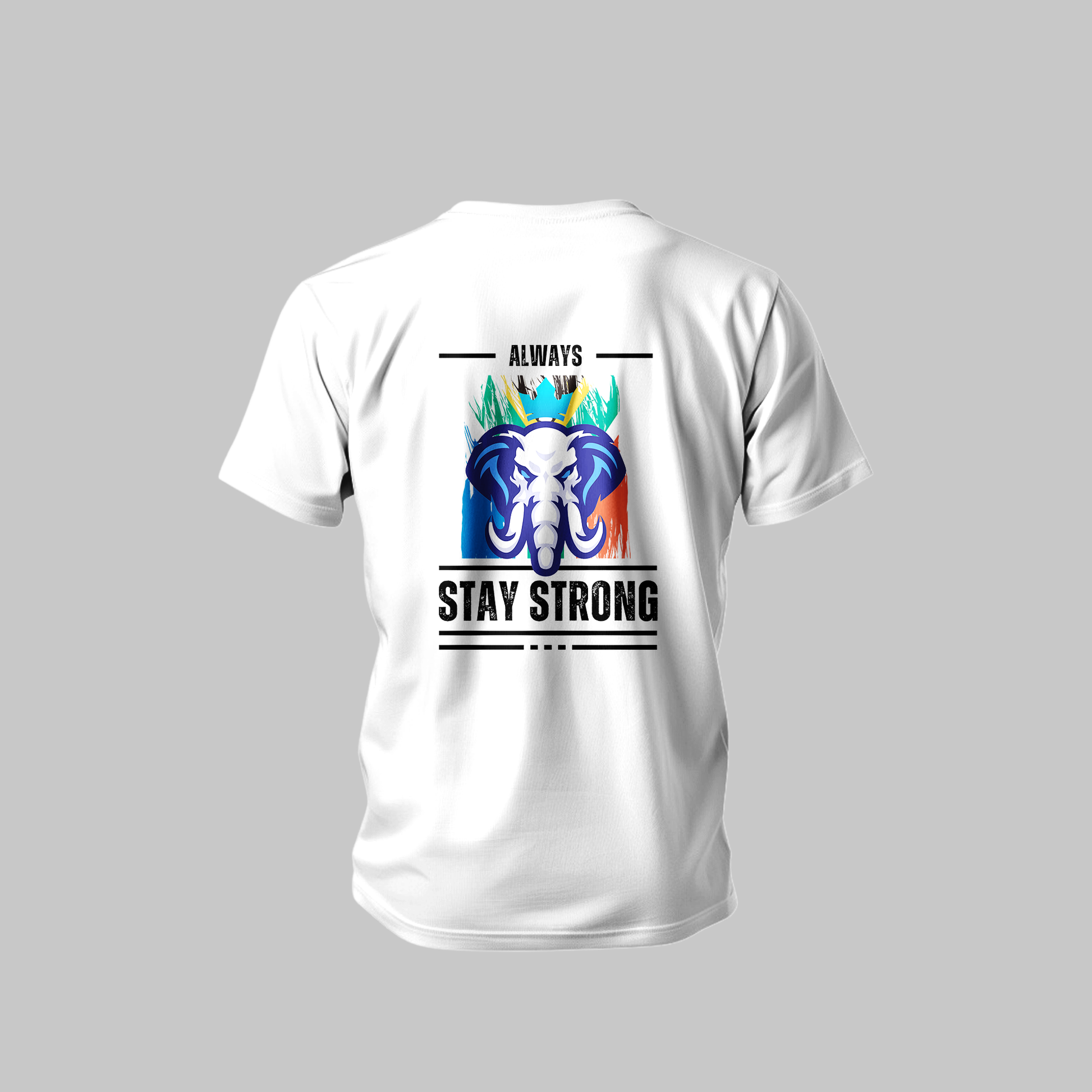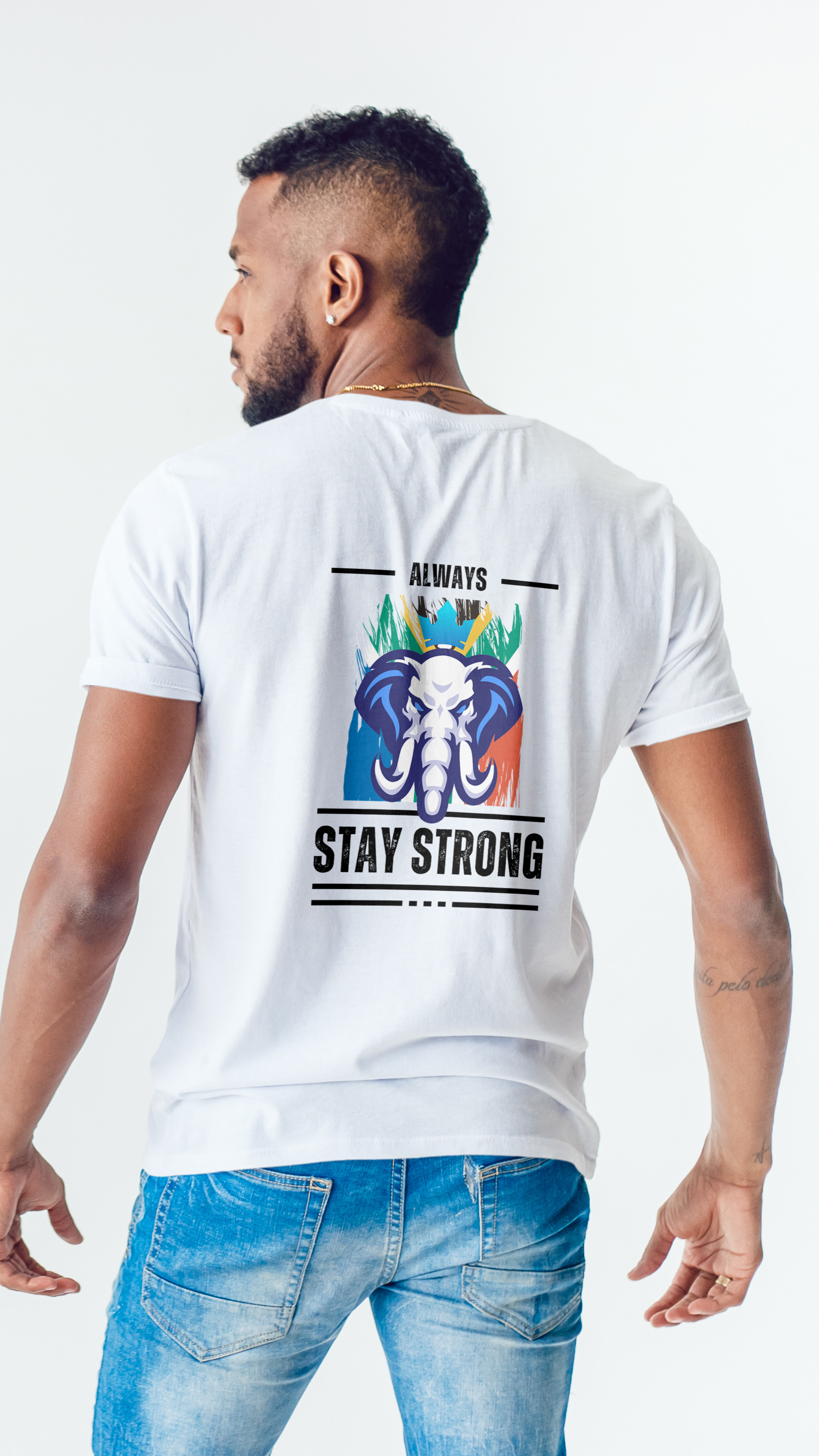 - Back Graphic: Bold and colorful “Stay Strong” statement with a striking elephant illustration, embodying power and perseverance.