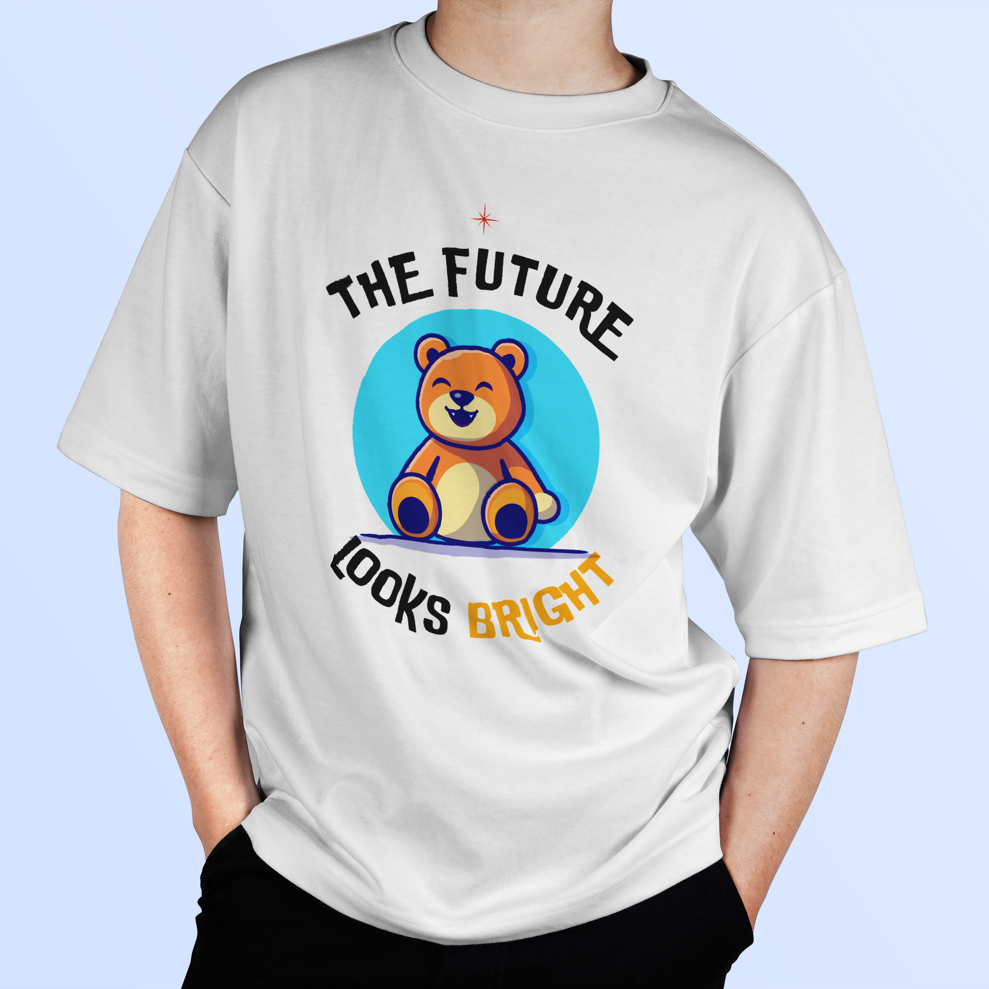 Step into the future with our bold and playful oversized T-shirt featuring an adorable bear graphic and the uplifting slogan, "The Future Looks Bright." This piece is perfect for anyone looking to make a cheerful statement while staying comfortable and trendy.